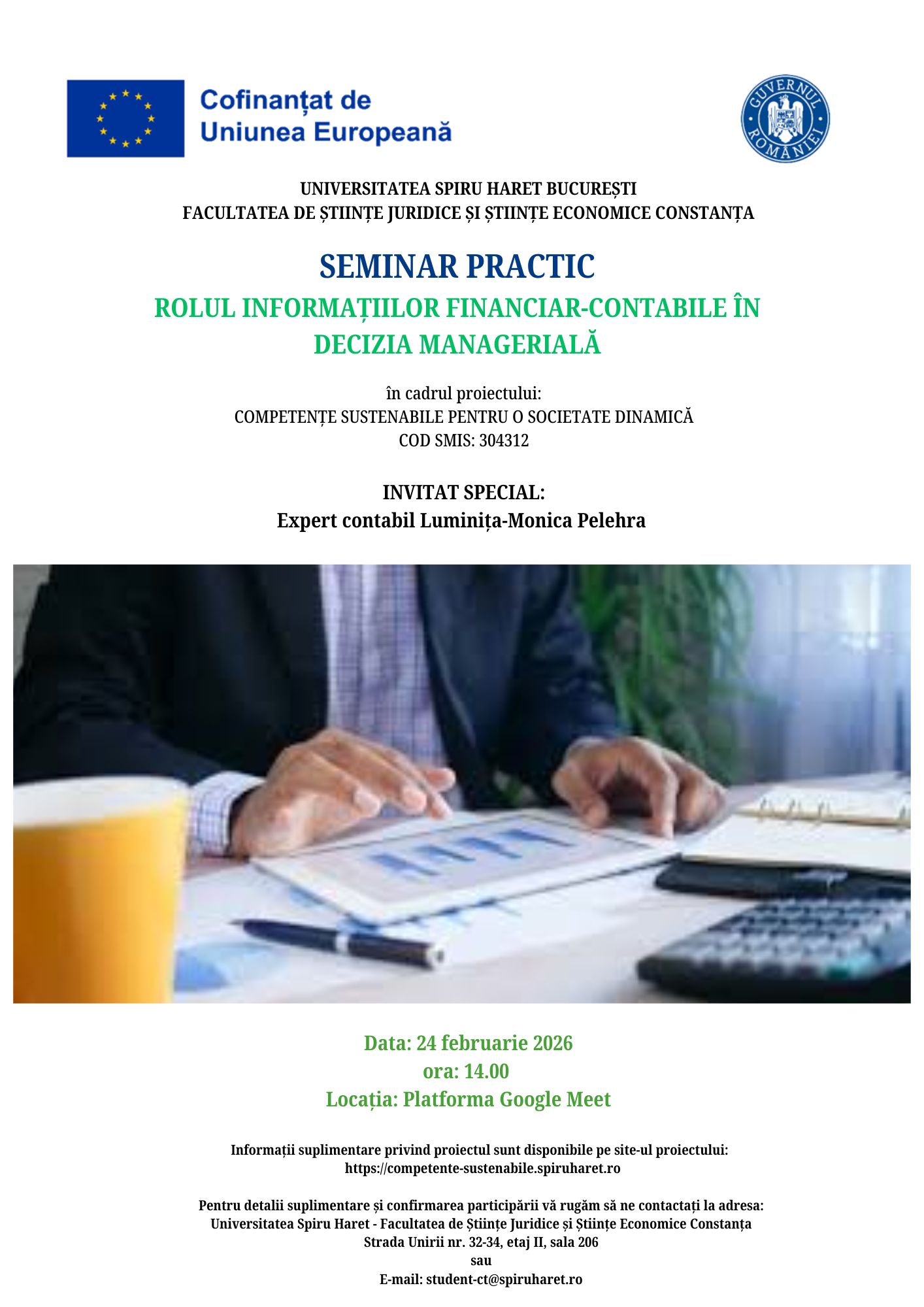 UNIVERSITATEA SPIRU HARET prin Facultatea de Stiinte Juridice si Stiinte Economice Constanta are placerea de a va invita la seminarul practic cu tema "Rolul informatiilor financiar-contabile in decizia manageriala", invitat special Luminita-Monica Pelehra, seminar organizat in cadrul proiectului "Competente sustenabile pentru o societate dinamica", proiect cofinantat prin Programul Operational Educatie si Ocupare 2021-2027.